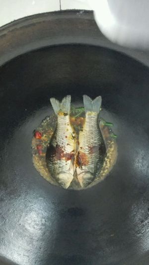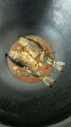 锅洗净,重新倒入油,加热,放入泡椒,蒜,姜,豆瓣酱翻炒,放入煎好的鲫鱼,翻炒。