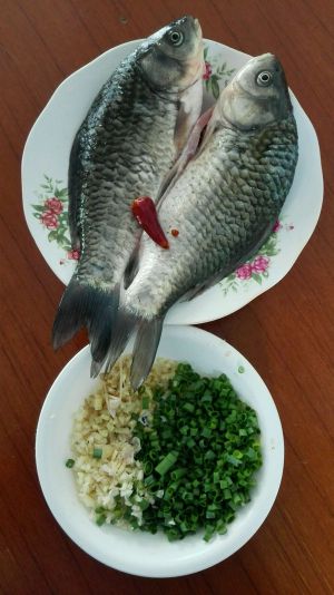 将杀好的鲫鱼抹上细盐和料酒,腌15分钟,去腥。蒜切成末,姜切丝,另备葱花小红椒待用。