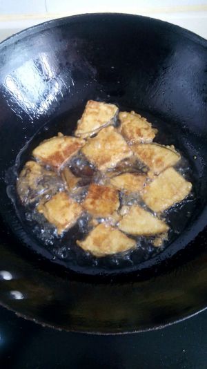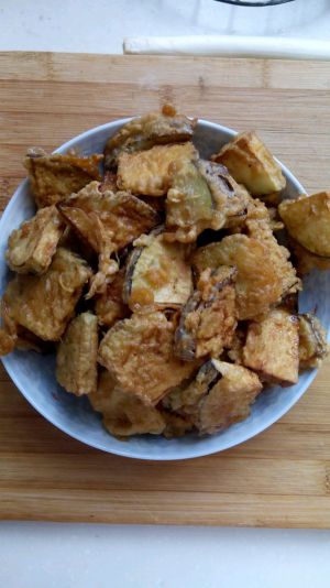 炒锅倒油炸裹好面糊的茄子块(小火炸)。