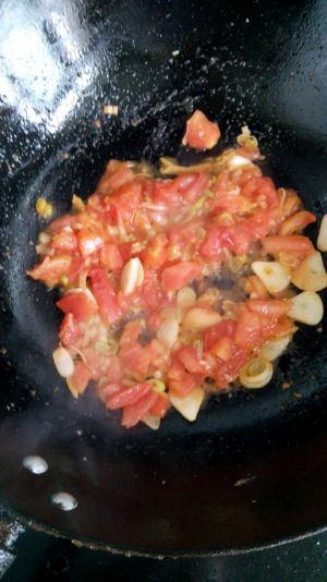 炸好茄子倒出多余的油,利用锅上残留的油炒香葱姜蒜,放入西红柿翻炒1分钟。