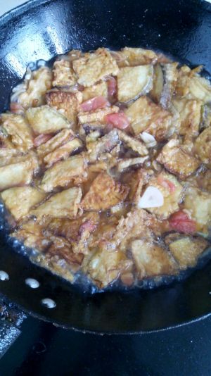 倒入茄子块翻炒一下加适量的水,盐,大火烧开换小火炖,在炖的期间里不要翻炒,很容易烂的。