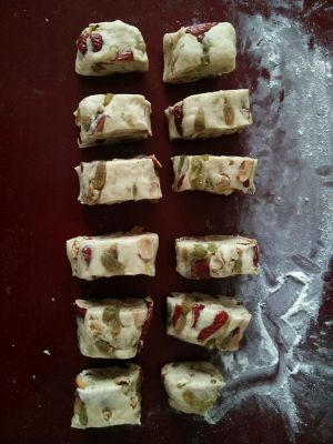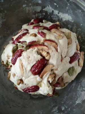 加入红枣,提子,核桃仁一起揉面团,记得要均匀哦