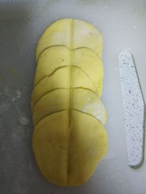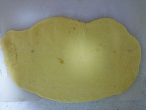 发酵至两倍大,排气干成大片状,卷起,切成段