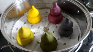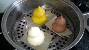 蒸好了,形状倒下去了,因为在锅里还在继续发酵膨胀!面团与馒头形状不一一直是我的致命伤,每次兴致勃勃的,捏好各种形状,出锅又是另外一个模样,好受伤!!!
