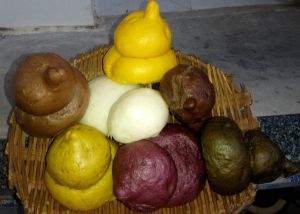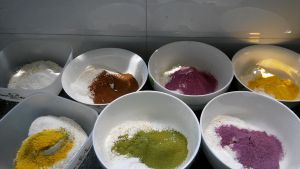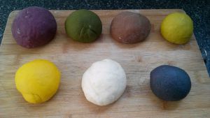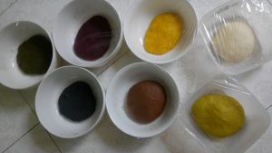 面粉分成七份,每份加上不同颜色的粉,白色那个是原味。两个紫薯粉,一个加点小苏打,它就会变成跟青色!