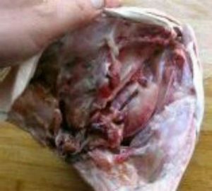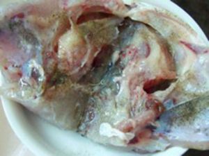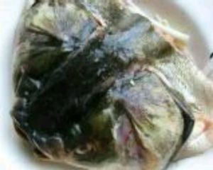 用水仔细冲洗干净内腔,,并将鱼头撕去里面的黑膜,然后用刀剖开从鱼肚至鱼嘴,再用刀切一下,使鱼头能平整展开成一条直线。