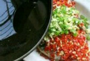 在鱼头上铺满剁椒。