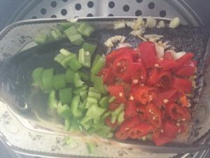 铺上辣椒上撒上盐和酱油料酒腌制一会,然后上锅蒸蒸熟