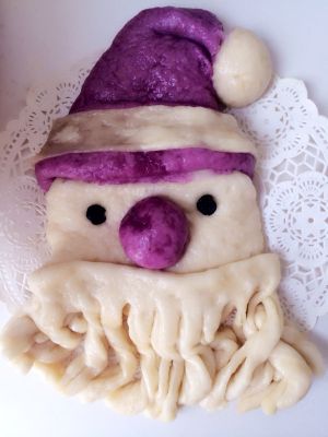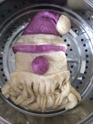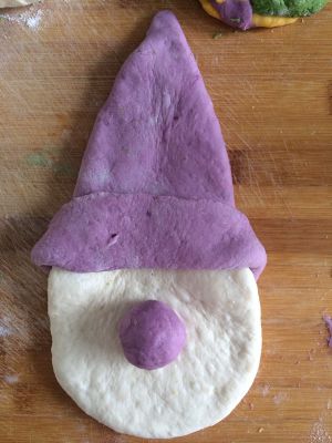 两种面团和好28度发约1.5小时,白色面团揉圆按扁,取一块紫色面团揉圆做鼻子,另取一块紫薯面团擀片折边后包住白色面团顶端做帽子