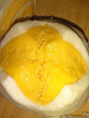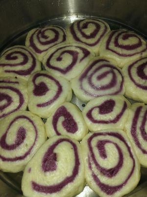 白面团擀成饼,黄面揉成团,放白饼上包包子包好,刀切十字,醒十五分,蒸20分钟,详细步骤搜紫薯开花馒头