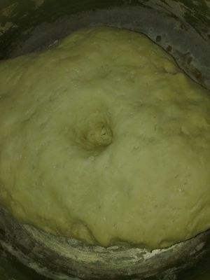 面粉水酵母的比例是10:5:1,这次用玉米原汁和面相比水略干了点所以额外另加10克水,所有配料和成光滑的面团发酵两倍大。