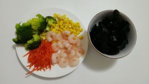木耳提前泡水,西兰花虾仁焯熟,胡萝卜切丝