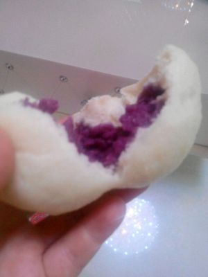 接下来,我们把食用碱用温水化开,揉在面团里,不能一次放进面团里,我们分次放进去,一边揉一边放,揉到面不沾盆,不沾手就好了,你也可以闻香味哦,活好的面团弄成一个一个小面团赶成面片,把紫薯馅或者豆沙馅放到面片里团成圆形就可以了,所有的弄好后,就可以上锅蒸了,大约蒸20分钟就熟了哦!