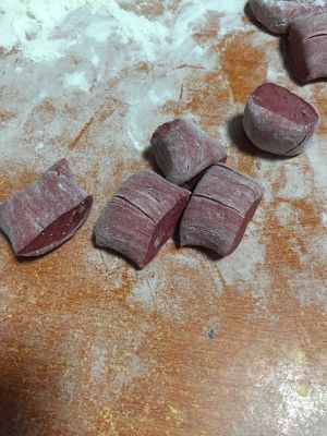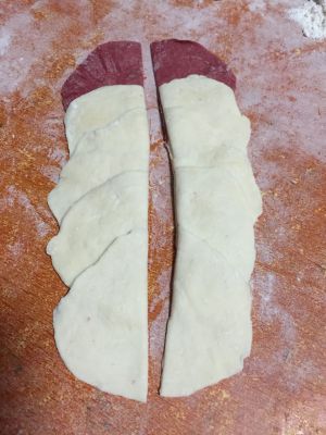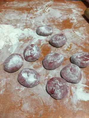 用温水把发酵粉化开,把面和紫薯泥搅和,揉成面团!