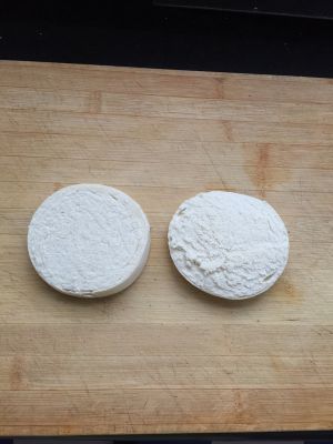 1.一个圆形的小馒头用刀子沾点水横切成三片,不要顶部的盖子。