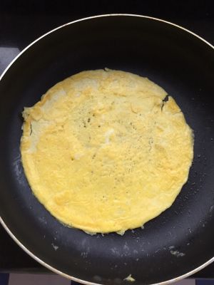 4.两个鸡蛋搅匀,平底锅放少许油,鸡蛋液倒进去转圆成一个圆饼,煎至饼的表面凝固,饼的四边用铲子弄开,用手抓住饼翻面另一面也煎熟。