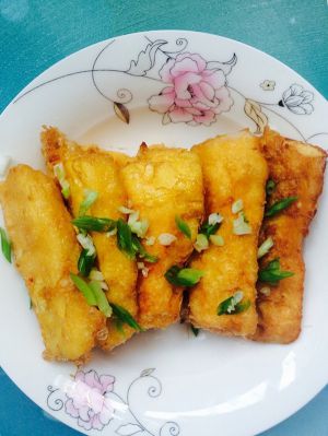 锅内的油热后,将馒头片均匀的沾满蛋液后下锅炸烤。油温不宜过高,馒头片下锅后可转为小火,待其变金黄色就快速翻面。