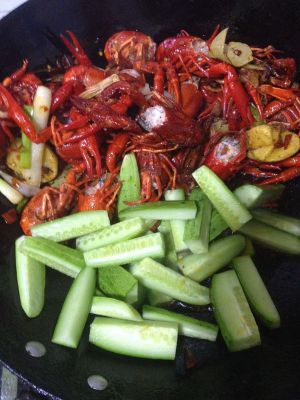 加入炒过的小龙虾和黄瓜段,配菜可自选,也可不加,翻炒均匀。