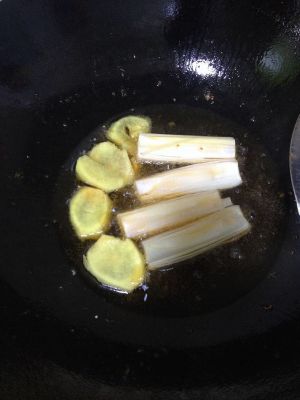 继续加入干辣椒段花椒八角桂皮香叶小葱白,翻炒出香味。