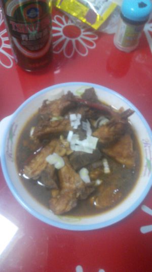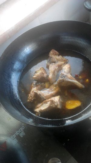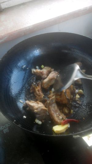 倒入料酒,生抽老抽,翻炒。加水没过排骨,加入桂皮与八角。炖煮三十分钟。味道不够了加酱油~
