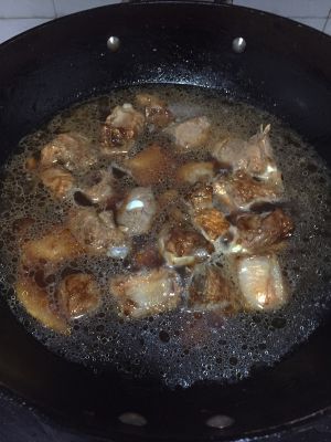 排骨煎好,放4个饭碗的水,加入老抽和味极鲜,大火煮开,转小火煮20分钟
