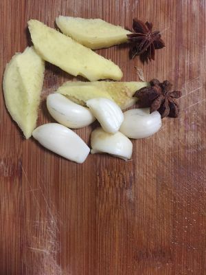 向锅里加入葱段,姜块,蒜,八角,一勺料酒,两勺酱油,适量盐,大火至水开
