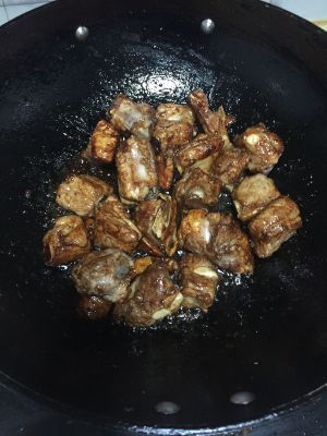 将油倒入已经热的锅里,油热后调至中小火,放入两勺糖,用锅铲搅拌化开,待变色后倒入排骨,翻炒