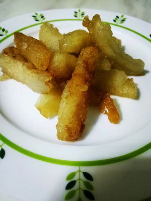 将油倒出,清洗一下锅,把锅烧热。倒入适量白糖,搅拌两下,放入少许水,搅拌至白糖焦黄,放入炸好的馒头,不停翻转至全部变黄就可以捞出,火候不要太大,慢慢来哈~不然就会糊了