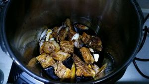 倒入料酒,生抽老抽,翻炒。加水没过排骨,加入桂皮与八角。炖煮三十分钟。味道不够了加酱油~