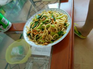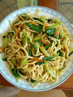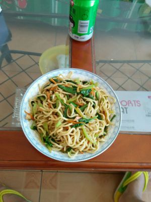锅里加水,煮好面条,过凉水后再滤去水分,加入少许橄榄油拌匀,(家里正好有,橄榄油加我觉得炒出来的面条不油腻)使面条不会粘连在一起