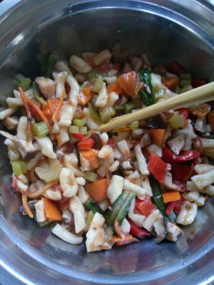 然后倒入丁丁面,翻炒。即可出锅(也可放肉炒)