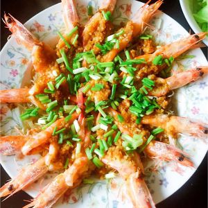 将蒜头切成特别小的丁丁,用油爆炒蒜沫,放少许生抽、盐、糖后淋在虾身上,因为在蒸的过程中会有蒸汽水到碗里所以不要放水在碗里 直接将淋好汁的虾整盘上锅大火蒸,等水开后蒸到虾变色就可以了,大约5分钟就可以了 起锅后撒少许葱花,烧热油后淋在葱花上