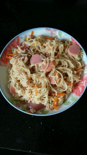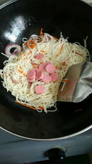 看着洋葱丝胡萝卜丝有点软了,倒入面条、香肠、海天酱,盐,鸡精翻炒,加了点水,防止粘住。