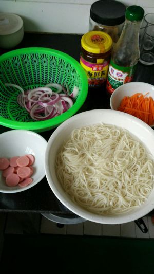 胡萝卜,洋葱切丝,香肠切片,面条事先煮好放入凉水中