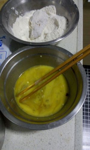 腌制20分钟后,便可开始沾鸡蛋液了。
