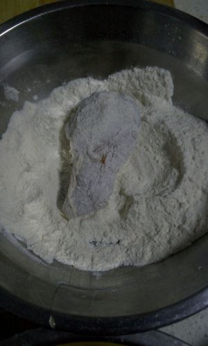 将粘了鸡蛋液的鸡翅,放进面粉中,裹足面粉后放入油锅中炸。