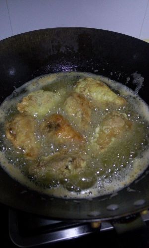倒入适量的油,已掩盖鸡翅为宜。将油加热至五分热后开始放入鸡翅,并频繁的翻动鸡翅,次步骤可保证整个鸡翅受热均匀,色泽金黄。从入锅到出锅,大概10-15分钟左右便可。