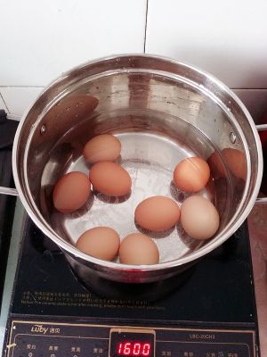 锅中加水,没过鸡蛋二分之一,大火烧开后,转小火八分钟,关火。