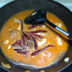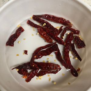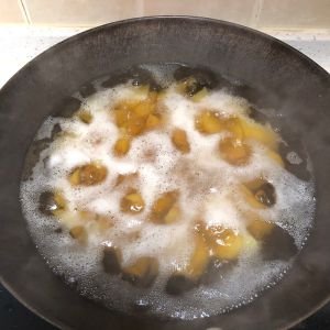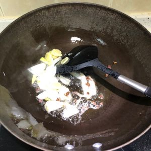 热锅下油,油热后放入花椒炒出香味把花椒捞出,放少许冰糖上色。