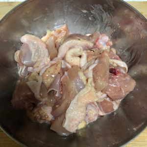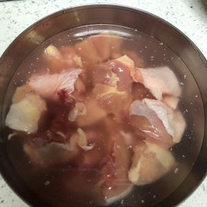 我是买的一直整鸡让卖家剁成小块,先把鸡块洗净,烧开水下入鸡块过一下水把血沫子弄出来,开水下锅两三分钟就好不然鸡肉会老,捞出控水备用。