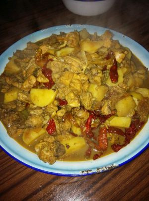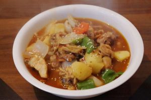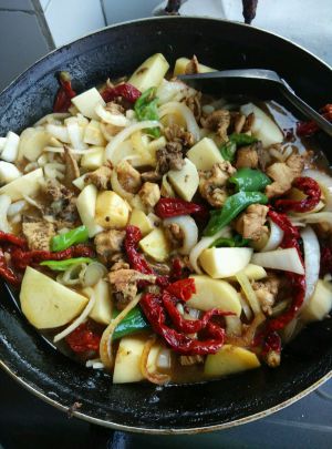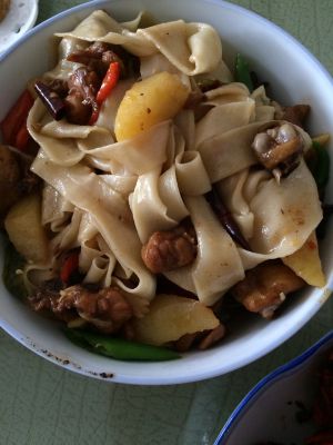 被诱惑到的大盘鸡,缺少了裤带面,连我这个不怎么吃面的人这次都吃了三根,面团一定要柔软出来的面才会好吃,而且会很好拉扯成裤带面