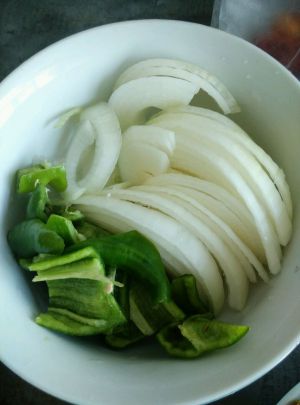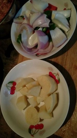 准备土豆块儿、洋葱片、青椒片(家里没有了就没放)、西红柿丁或者番茄酱,葱、姜、蒜切片、干辣椒切段儿