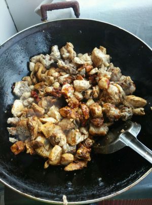 。 、辣椒下锅爆香,放入白糖,放鸡肉翻炒。