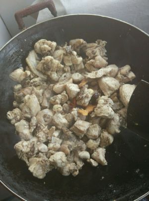 鸡肉飞水,锅中放入油,花椒,草果,八角,陈皮,生姜爆香,加入鸡肉炒至鸡肉表面微微发黄