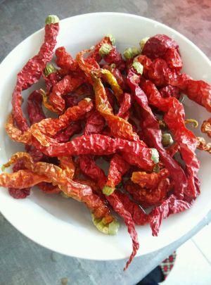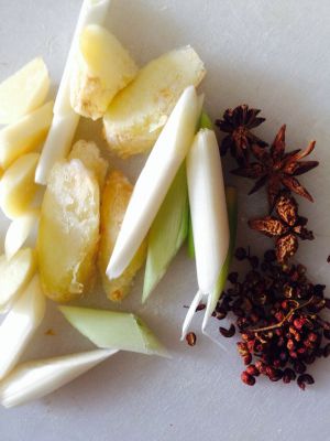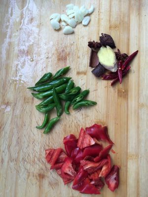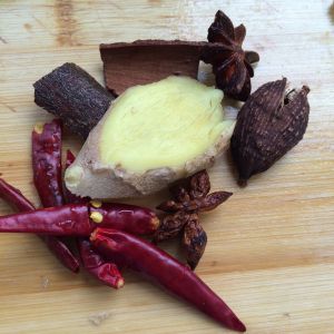 干红椒、大料、桂皮、草果洗净,生姜切一大块
