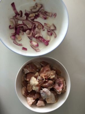 两个大鸡腿剁块后洗净,放适量盐,将洋葱切片后一同腌制,用手抓揉,蒙上保鲜膜放保鲜室腌制一小时后,将鸡肉挑出