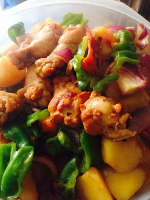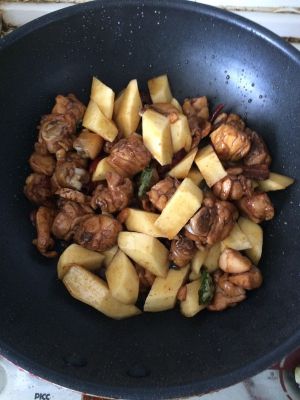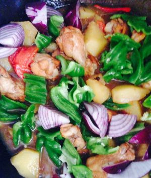 炸好后的鸡肉土豆入砂锅 加青红椒洋葱炖煮 大火收汁即可