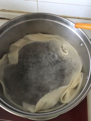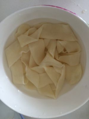 取出醒着的面片,手拽着两头,自然放松成裤带面,下入开水的锅中,下完三片煮三十秒后捞出