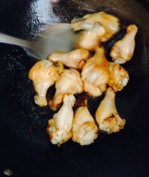 然后炒糖色,放一些油和糖, 小火!小火!小火! 然后放花椒大料 炒一下,放鸡肉,要煸炒一会哦 鸡肉要把水晾干,不然炒的时候会渐出来,正好家里有鸡翅根,不要在意