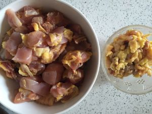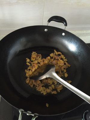 加入鸡子,料酒,小茴香,孜然,中火继续煸炒至鸡子变黄出油,,大概五分钟,鸡子事先热水汆一下